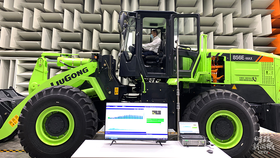△研发中心的半消声实验室正在为一款纯电动装载机检测噪声数据。(总台央视记者程铖、张晓鹏拍摄)