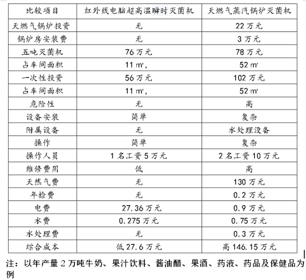 红外线电脑超高温瞬时灭菌机每台总投资56万元,传统蒸汽灭菌机总投资103万元,包括灭菌机、锅炉及锅炉房、水处理设备。“红外线电脑超高温瞬时灭菌机”节约投资27万元。红外线灭菌机,年生产2万吨饮品能源成本27.6万元。传统蒸汽灭菌机年生产2万吨饮品能源成本146.15万元,红外线电脑超高温瞬时灭菌机年节约生产耗能成本118.55万元。红外线电脑超高温瞬时灭菌机”与“传统蒸汽灭菌机”相比有以下七大综合优点: