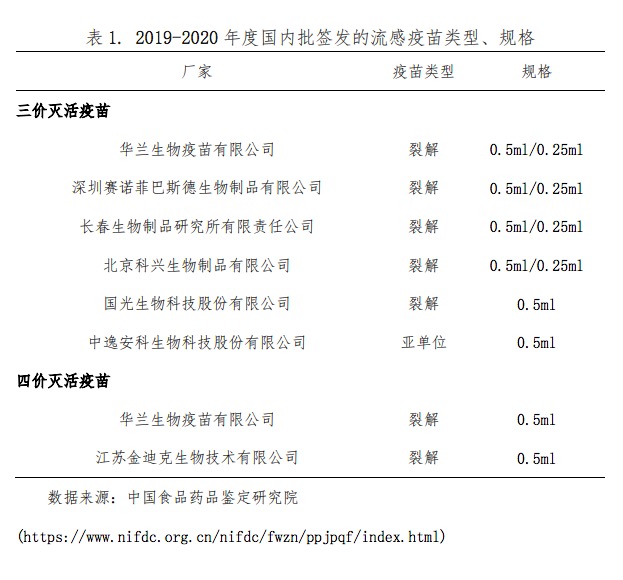 国内流感疫苗批签发类型和规格。 来源:《中国流感疫苗预防接种技术指南(2019-2020)》