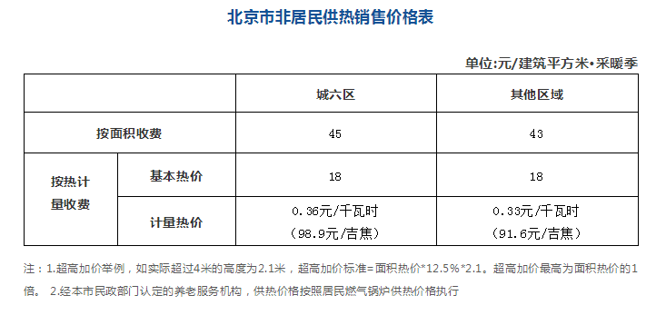 北京日报客户端记者梳理发现,非居民供热价格的收费计算方式有按面积收费和按热计量收费两种,其中按面积收费的,每建筑平方米统一上调3元,城六区、郊区非居民供热价格分别由现行的每建筑平方米42元和40元调整为45元和43元。