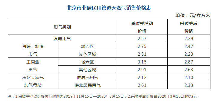 根据上游供气价格变动情况,本市非居民用管道天然气销售价格相应调整:自2019年11月15日至2020年3月15日,执行采暖季季节性价格,在现行基础上上浮0.26元/立方米;自2020年3月16日起,取消上浮,按照国家降低本市天然气门站价格的水平,在现行基础上下调0.02元/立方米。