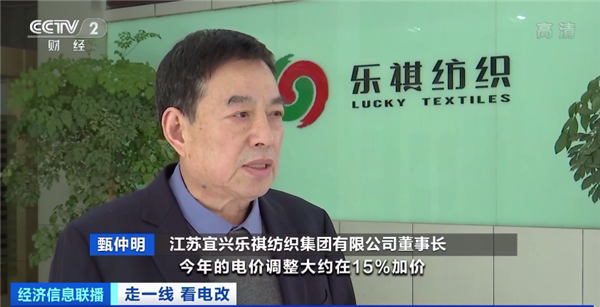 江苏宜兴乐祺纺织集团有限公司董事长甄仲明:对于我们企业来说,今年的电价调整大约在15%加价,也就是说我们每年在这一块要增加500万到600万元 。