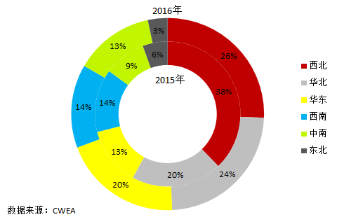 其中,中国西北、华北、华东、西南、中南和东北六大区域的风电新增装机容量所占比例分别26%、24%、20%、14%、13%和3%。