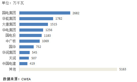 国电集团在2016年新增装机容量为261万千瓦,排名中国风电开发企业之首,大唐集团、国电投、华能集团以及中广核名列二至五位。市场份额方面,国电集团以2682万千瓦的累计装机容量占领了15.9%的市场份额,华能集团以1782万千瓦排名第二,大唐集团的市场份额为9%,累计装机容量为1515万千瓦。