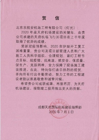 “2020年是天府机场建设的关键年,由贵公司承建的天府机场飞行区项目在上半年度取得了优异的成绩。