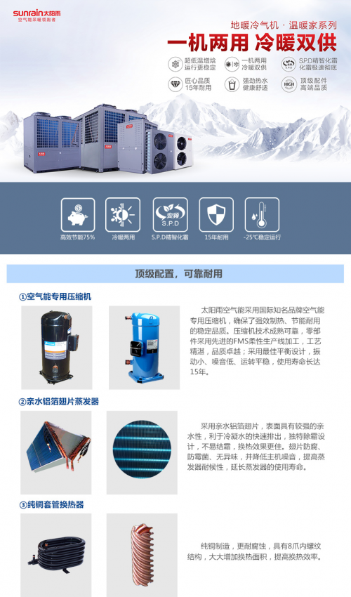 以太阳雨空气能温暖家系列超低温冷暖机为例,产品采用了国际知名品牌空气能专用压缩机,制热效果好,性能出众。同时机组搭载了特有的喷液增焓技术,在-25℃下依旧运行稳定,满足寒冷地区的制热需求,能效比是普通电采暖的三倍以上,节能性突出。