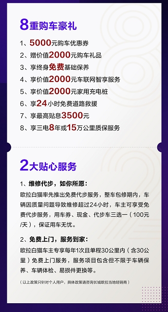 同时还在天猫、B站和抖音等平台开启了欧拉白猫专属服务政策,以及9.9元抵5000元购车优惠券、赠送价值2000元购车礼品等8重购车豪礼+两大贴心服务,实打实地减轻了后浪少年的购车压力。