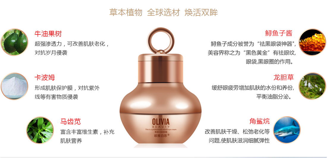 欧雅伯思眼霜坚持“自然、健康、安全、有效”的护肤理念,是国内第一款眼部肌肤重生护理套装,“眼霜+眼部精华”多种天然美容元素使眼部皮肤更易获得充足营养,细腻棉密的乳霜质地,能深入眼肌肌底,激活活性细胞,淡化细纹,消除眼袋,去除黑眼圈,帮助肌肤重塑眼部优雅轮廓。