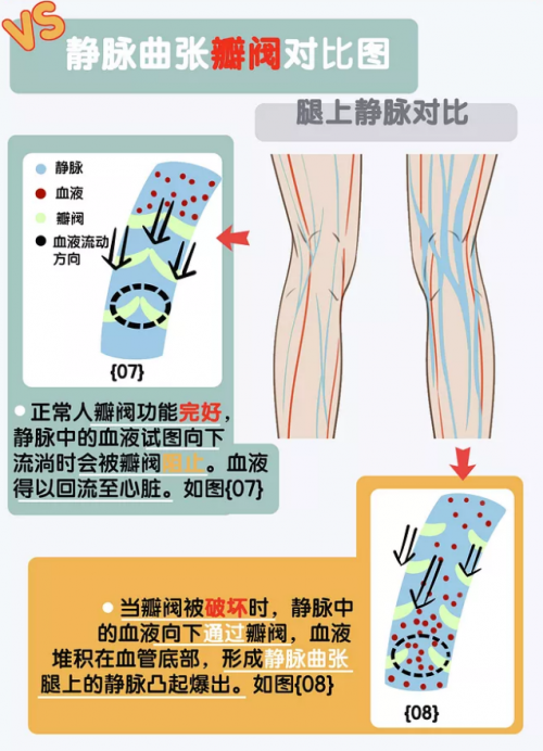 静脉曲张真的只是血管凸起,影响美观吗?它真的不会给双腿带来其他的改变吗?错!静脉曲张是静脉瓣膜受损,导致血液回流出现障碍,无法回流到心脏,不能回流的这部分血液就沉积在了腿部,随着时间的累积,堆积的血液会越来越多,导致静脉出现硬结,形成静脉曲张!