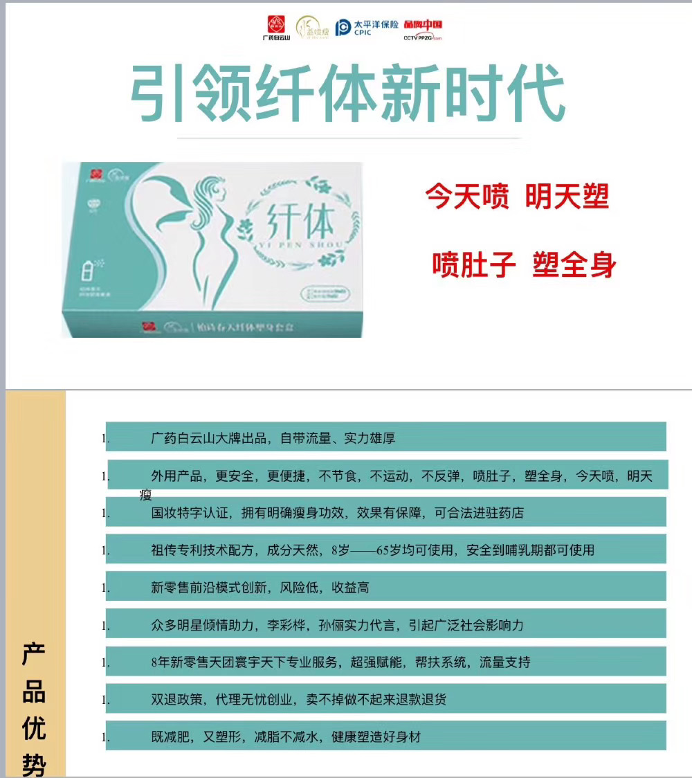 在益喷瘦5G新店商超级模式中,最根本的还是要落在产品上,只有手握一款有市场的“刚需爆品”,才能顺利敲开成功的大门。而这个“刚需爆品”,指的就是益喷瘦。减肥是永远不会过时的“潮流”,和市面上其他的减肥产品有着本质上的区别,益喷瘦是一款不需要节食,不需要运动,由广州白云山医药科技有限公司推出的一款针对减肥群体问题的外用产品,还有李彩桦实力代言,孙俪倾情助力,引起广泛社会影响力。广药白云山医药科技发展有限公司依托白云山股份有限公司强大的后盾,销售其高科技含量产品,属于广药集团成员之一,知名大企业,实力雄厚,前景广阔。
