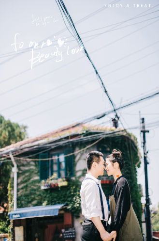 善用亮色小道具:外景婚纱照情侣装拍摄时,一些小道具的帮助可以令新人摆的Pose更舒服,特别是针对经验不足的新人,能有效改善不自然的表情,同时亦可以辅助拍摄的作用,尤其是那些颜色艳丽的小道具,能让画面变得更丰富。
