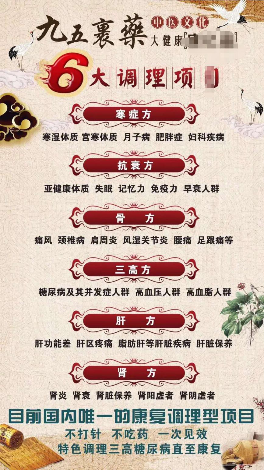 九五裹药属于典型的康复养生项目,专门是针对各种常见的慢性病调理与恢复。比如说现在很常见的高血压、高血糖、高血脂、骨关节风湿问题、高尿酸血症、肥胖问题、各种亚健康问题等,体验一次即可见效果的神奇之处。同时,也能够针对各种女性疾病进行调理养护,包括了月子病、月经不调、子宫肌瘤等等。
