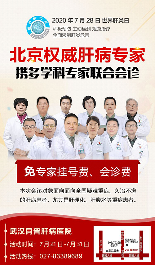 7月28日是世界肝炎日,为响应世界肝炎日号召,普及肝炎防治常识,提高肝病防治水平,武汉同普医院肝病专科面向全国开展“世界肝炎日宣传月——暨北京权威肝病专家团联合会诊”活动。充分利用知名专家及前沿技术共享资源,为广大患者提供实实在在的健康保障!