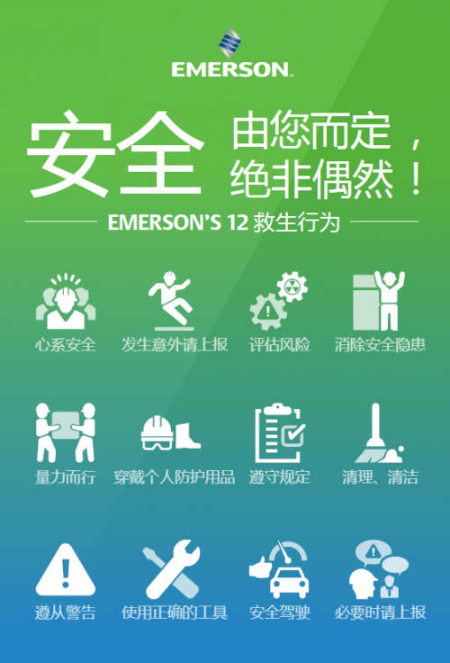 在艾默生,安全不是一个选项,而是坚定的承诺。艾默生承诺为所有员工打造一个安全、健康的工作环境,为员工自己的安全负责,也为周围人的安全负责。
