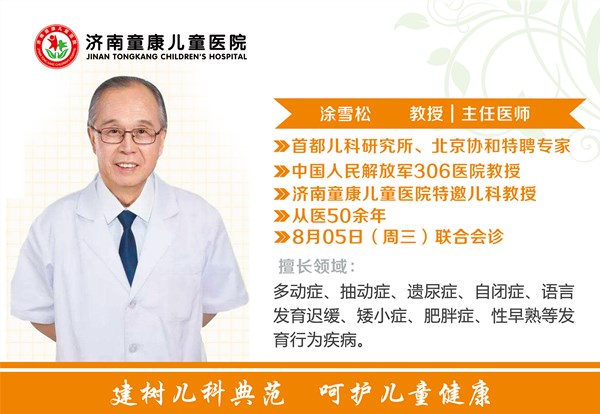 经常有家长抱怨说:“孩子的病看了多家医院没好,想去北京又太远了,预约北京专家更难。”为了方便山东及周边省市的患者接受更好的诊疗服务,在济南家门口就能看上北京名医,济南童康儿童医院8月5日(周三)邀请北京知名儿科专家--涂雪松教授莅临会诊,为儿童患者的健康保驾护航!