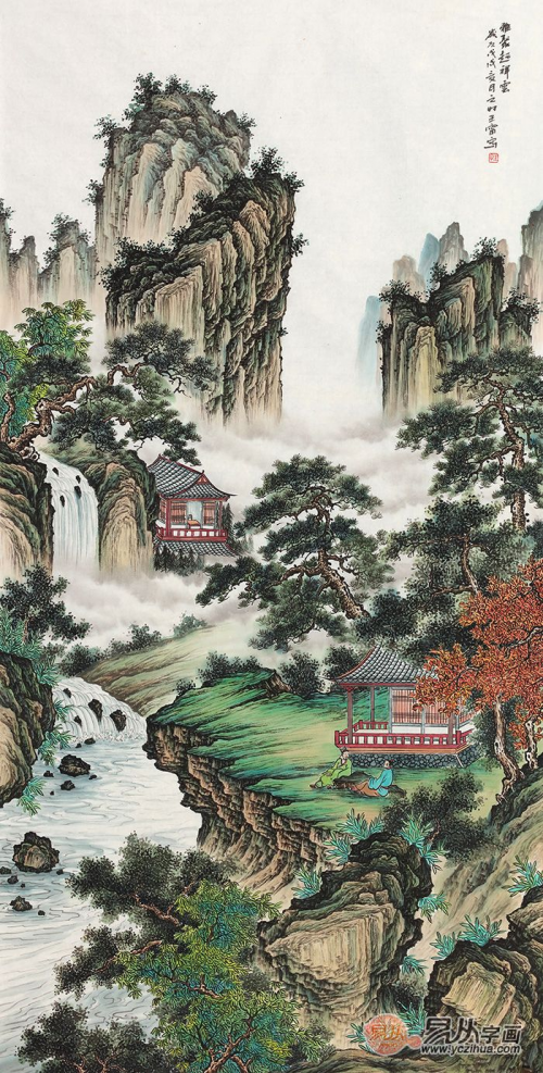 王宁新品青绿山水国画作品《雅聚起祥云》作品来源:易从网