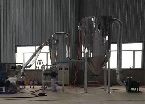 国涵粉体设备将物料研磨后,风机将风吹入主机壳内,吹起粉末,经置于研磨室上方的分析器进行分选,细度过粗的物料又落入研磨室重磨,细度合乎规格的随风流进入旋风收集器,收集后经出粉口排出,即为成品。风流由大旋风收集器上端的回风管回入风机,风路是循环的,并且在负压状态下流动,循环风路的风量增加部分经风机与主机中间的废气管道排出,进入小旋风收集器,进行净化处理。
