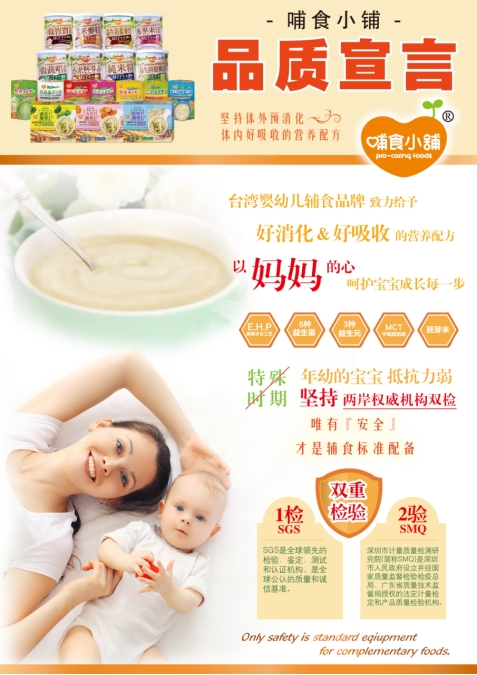 哺食小铺辅食系列产品-哺食小铺米精华、谷智宝宝宝粥、生机小农营养米面条,严守质量防线,均采用台湾当地当季谷物、蔬菜、水果为原料,选用安心食材不添加防腐剂、人工色素、香精,坚持多重合格检验标准,守护宝贝的辅食安全。