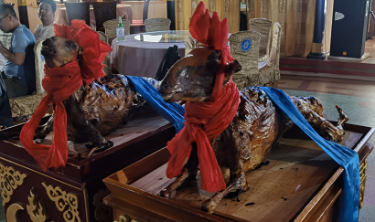 到了傍晚时分,大家抵达蒙古汗城景区,享用牧民家蒙餐风味餐。店家很热情的招待,里面很多蒙古食物都是大家第一次见与品尝,特别是奶类品、烤全羊、羊血肠和沙葱等。