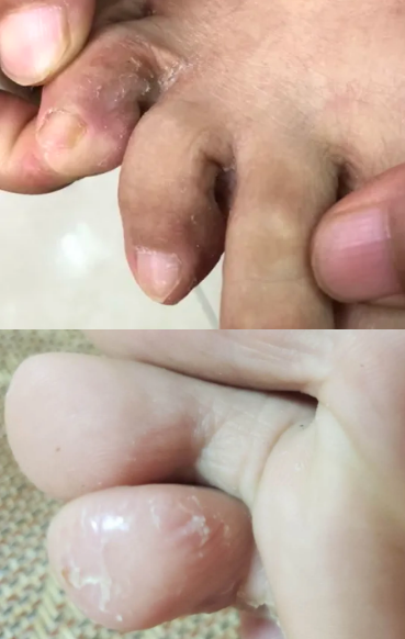 皮疹初起为脚趾缝里的表皮角质层浸软发白,转呈糜烂潮红湿润。严重时继发细菌感染,出现足背和小腿红肿热痛,是小腿丹毒的主要诱因。