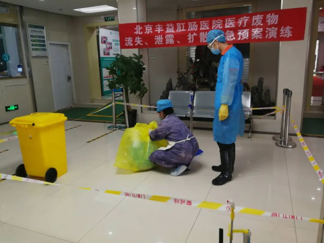 为进一步提高我院医疗废物院内意外泄露、流失、扩散后的防控应急处置能力,确保医疗废物在院内收集、运送过程的安全性,2020年7月30日下午,我院在一楼院内门诊大厅开展了医疗废物应急处置演练,院护理部总监张彩霞总监主持了本次演练,院长吴萍、医疗废物专职管理员、医疗废物收集员、保安、管理负责人等人参加了本次演练。