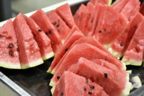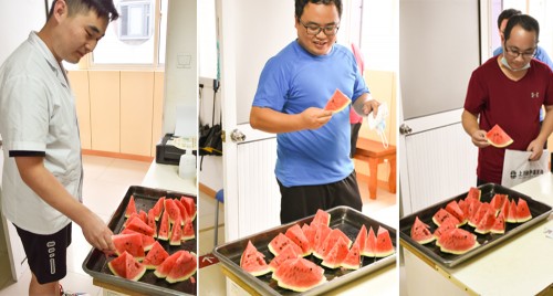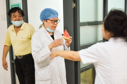 随后,医务科的同志将西瓜切成片分好等份,不仅让全院工作人员感受到徐女士的浓浓情意,也把这份真挚情意传递给当日到诊患者——感恩分享现场,和患者一起品尝。
