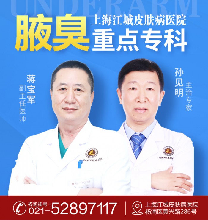 就医直通车:上海江城皮肤病医院-腋臭专病门诊,电话预约挂号,狐臭患者可直接拨打:021-52897117,即可跟工作人员提前预约专家门诊,到院后可避免长时间等候,直接就能看诊!