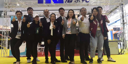 (图:廖献云在海秦花游乐设备展与同事合影)