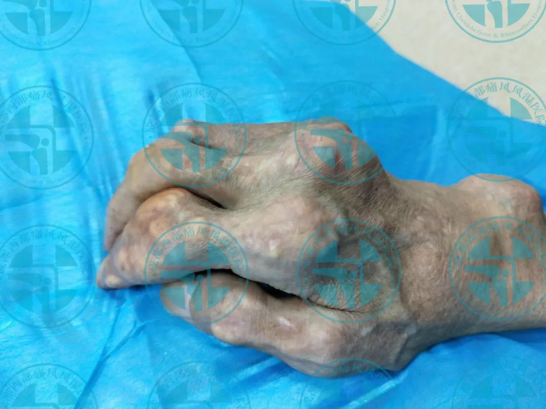 如果在痛风间歇期,或者未发作痛风,但尿酸持续高于540的重度尿酸升高问题不干预控制,尿酸盐结晶就很容易沉积在关节或身体的其他部位,这些沉积的结晶会引起周围组织的慢性排斥性炎症,从而逐渐被上皮细胞、巨核细胞包围,在中性粒细胞参与下形成结节,这种有尿酸盐结晶引起的异物结节,就是所谓的“痛风石”。