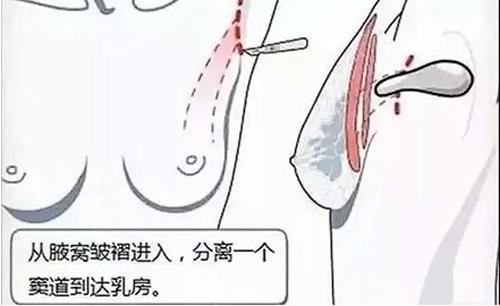 从腋窝皱襞进入分离一个隧道到达乳房假体放置区域,腋窝切口一般都平行于腋窝皮肤褶皱,切口长度因不同种类的乳房假体和体积而异,长度一般为4-6cm。医生一般会沿切口将深层组织剥离至胸大肌下面,进而向内下到达假体置入的位置,因此剥离的距离相对较大。