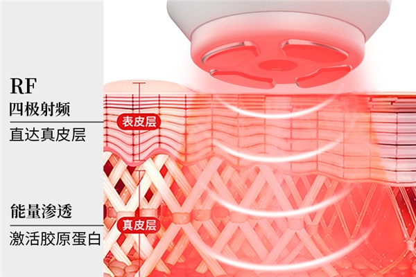 如意射频美颜仪是以四极射频为核心科技,通过发射四极射频能量直达真皮层,让纤维温度升高,促使胶原纤维收缩,分泌更多新的胶原质来填补萎缩和流失的胶原蛋白空隙,随着真皮层胶原蛋白不断新生和重新排列,让原本松弛有皱纹的肌肤变得更加紧致。我们知道,当人体脸部的肌肤出现小幅度的提拉,不再下垂,就会出现更显年轻的保养效果。在这个紧致的过程中,不少皱纹也会出现淡化的美容效果。