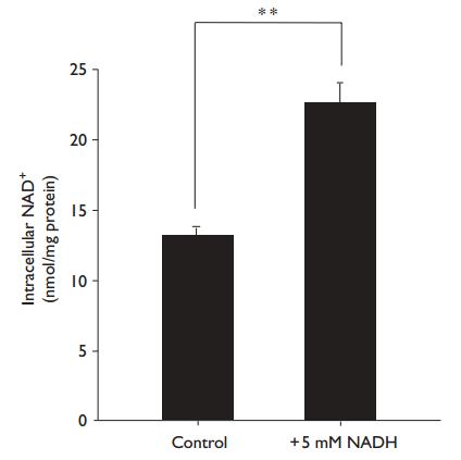 上图显示是给正常细胞添加5mM NADH2小时后的效果,可以看出细胞内的NAD+水平显著提升。说明NADH能够高效的提升NAD+水平。