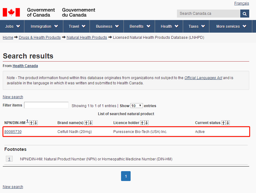 在投入市场之前,赛立复NADH经过长达一年多的审核,获得了加拿大政府颁发的销售许可NPN认证,在加拿大政府官网可查到具体信息。