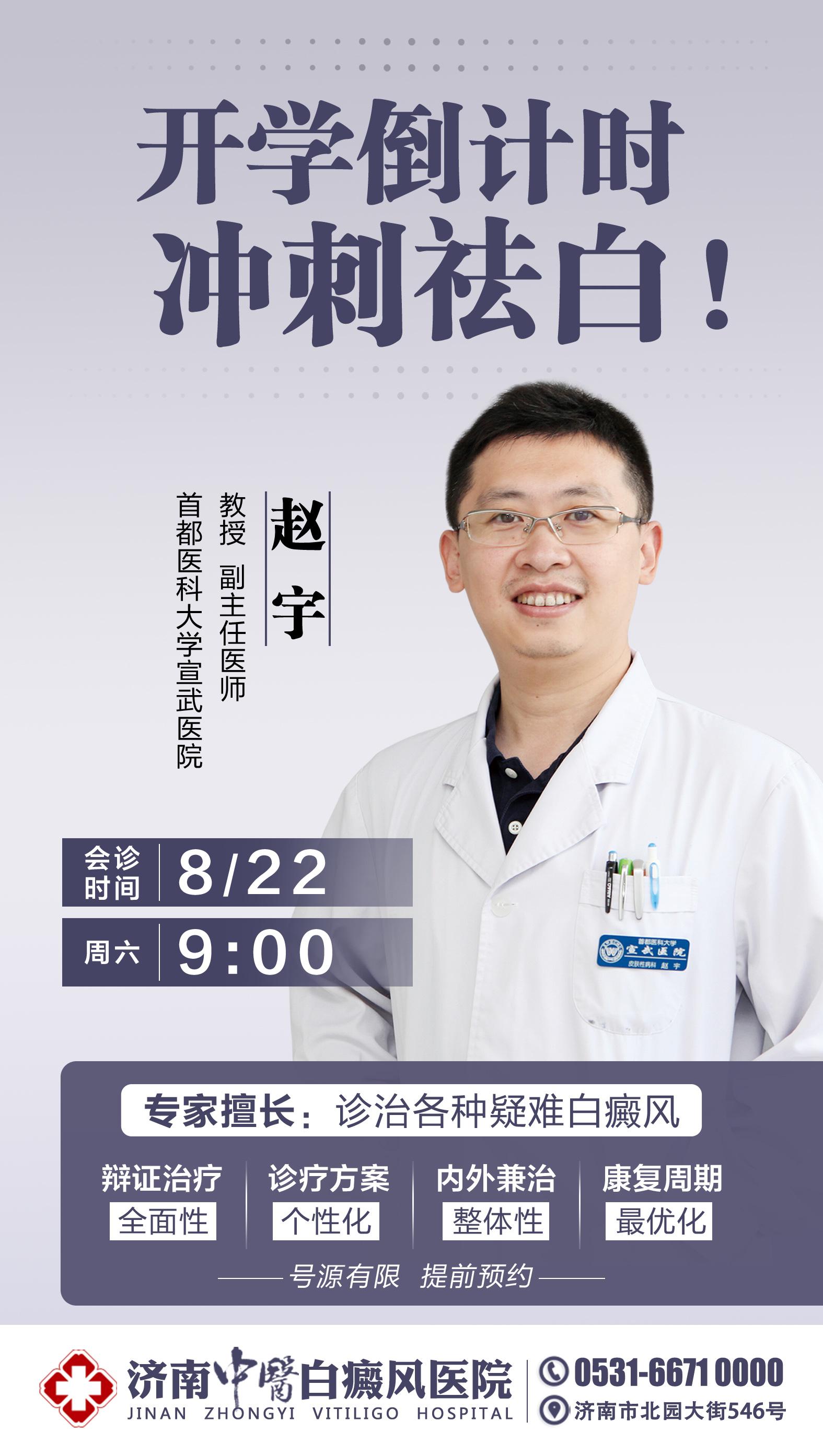 对于正处于暑假中的学生白癜风患者群体而言,暑期黄金祛白时机正在一天天地减少。白癜风确诊并不难,但这仅仅是治疗的第一步,真正要做到精准治疗离不开科学规范的检测、专家精准的病情分析与方案制定。应广大患者要求,同时也为了能让泉城以及周边患者及时就诊、复诊,济南中医白癜风医院应广大患者要求再邀祛白大咖赵宇教授8月22日(本周六)来院会诊。为他们暑假画上一个完美的句号,不留遗憾。