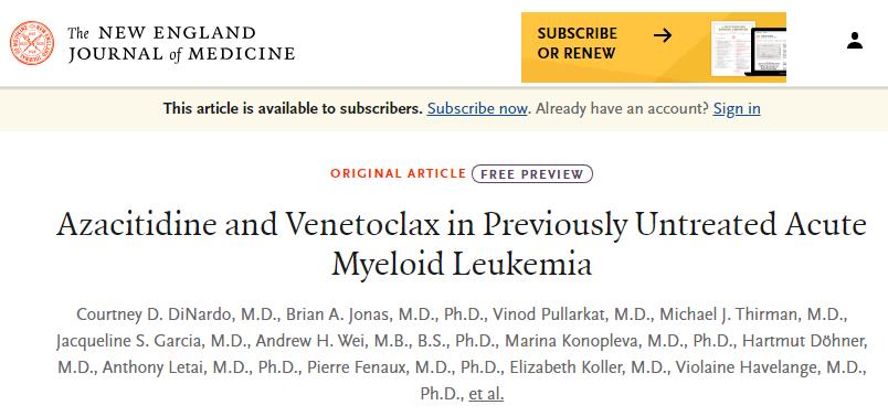与阿扎胞苷联用,治疗老年急性髓系白血病的III期临床表现亮眼。该试验数据已经发表在《新英格兰医学杂志(NEJM)》上。