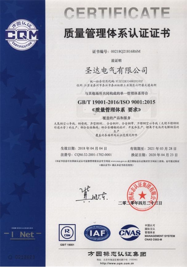 圣达电气早已于2001年通过了IOS9001质量体系认证,完善的质量管理体系、高精度的生产及检测设备保障了圣达电气空心导线的各项优异性能。