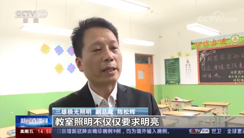 三雄极光副总裁陈松辉接受央视采访时强调,教室照明不应只做到明亮,还要关注光健康。因此在这次教室的灯光改造里,都采用教室专用灯具,并根据《中小学普通教室照明设计安装卫生要求》,标准教室按照“9+3”设计模式,采用9盏教室灯+3盏黑板灯,期望让孩子们能看得见、看得清、看得久。
