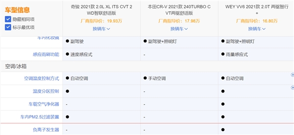 本以为奇骏仅搭载了PM2.5级空滤已足够单薄,没想到看了本田CR-V,我才知道自己定论过早。其配置表可谓“一片空白”,车载空气净化器、负离子发生器均无,甚至连最常见的车内PM2.5过滤装置都未见踪影。可见,CR-V还真是将日系车的“简配风”贯彻到底。