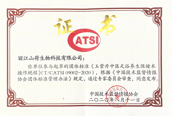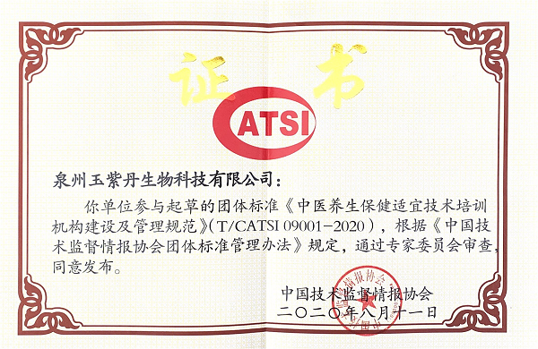 2019年由玉紫丹生物科技·中国生命关怀协会中医理疗技术传承与推广工作委员会,共同申报标准起草的中医药浴玉紫丹养生保健第三项玉紫丹中医足浴养生保健操作规程团体标准,经中国技术监督情报协会批准,专家组实验评审认证,获得2020团体标准。