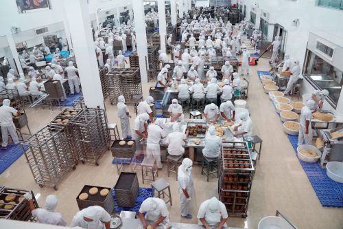 赏月会末,广东金九饼业有限公司代表带领大家参观金九饼业吴川生产基地月饼生产线,月饼制作车间约3000人同时工作,拌馅、制皮、包饼、打饼所有工序均采用传统手工制作。烘烤、包装和检测均采用国际最先进的设备,目的保证产品的质量和卫生安全。配备9条自动烘烤隧道炉,现场感受金九月饼特色传统手工制作工艺和现代化设备的完美结合。