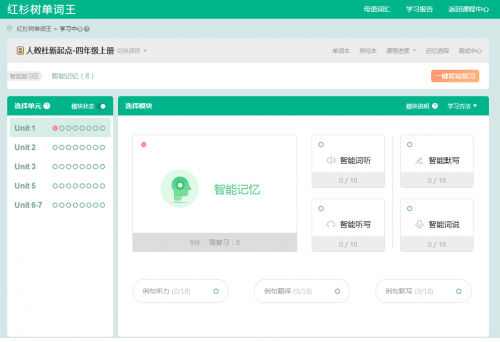 红杉树智能英语囊括全国所有中小学英语教材,拓展丰富。包含版本231个,课程1624套,单词614829个,例句559390句,与教材和课堂完全同步,每个年级按学期中的具体单元进行分类,可以同步进行句子、课文的跟踪训练、背诵、测试等,牢固记忆和应用,家长再也不用担心孩子学习进度追不上了。