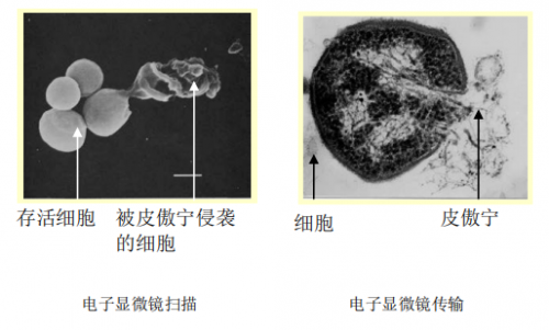 通过电子显微镜观察的最新研究结果表明,皮傲宁可导致生物体的损伤,全面瓦解细胞壁和细胞膜,从而使细菌无法繁殖。