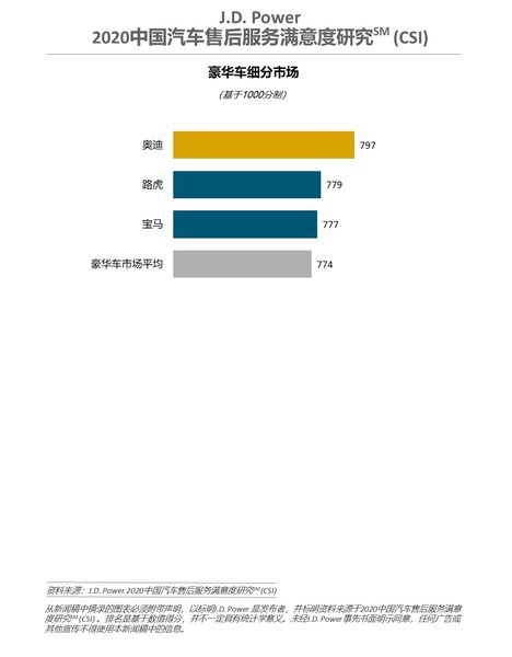 奥迪以797分位居豪华车细分市场售后服务满意度榜首。路虎(779分)和宝马(777分)分列第二和第三。