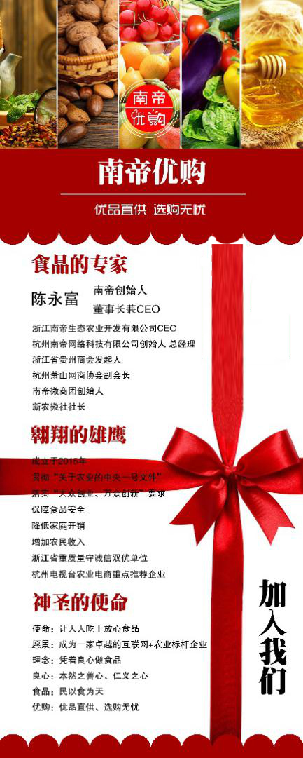 据了解,南帝优购是浙江南帝生态农业开发有限公司为百姓打造放心农产品销售及大健康生活的电商平台。2015年,公司创始人陈永富秉承着以“保障食品安全,降低家庭开销,增加农民收入”为宗旨,利用移动互联网、大数据及云计算等技术,构建“互联网+农业”新型电子商务模式,推出了南帝优购平台。