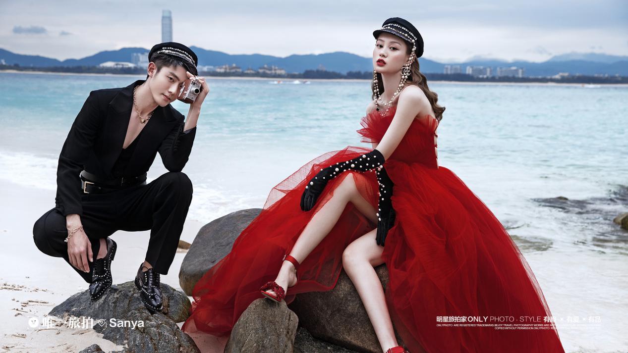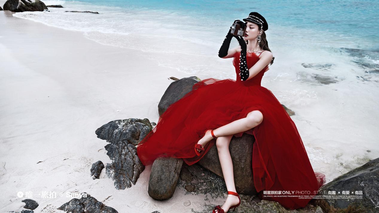 红色一定是结婚中必不可缺的一个因素,蛋糕层叠设计甜美优雅又不失大气,大拖尾简直梦幻至极,蓬松的轻纱质感,时髦高级还很大气,室外海滩的光线让整个画面更加有质感,营造出更加惊艳的时尚效果。