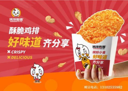 鸡排蜜语还邀请到了著名影星侯勇,成为了鸡排蜜语的品牌形象代言人,极大地增强了鸡排蜜语的品牌影响力和市场知名度。为了保证鸡排蜜语的产品品质,鸡排蜜语坚持使用专用的油炸,让鸡排更酥脆色泽更诱人,凉了以后也不返潮,专用的裹粉也让鸡排蜜语颜色更金黄,口感更诱人,最主要的是,鸡排蜜语坚持使用优选的白羽鸡作为食材,肉质丰富更有弹性,肌肉纤维也更适合腌制,所以说像鸡排蜜语这样的品牌必然是能在炸鸡市场上掀起大风大浪的。