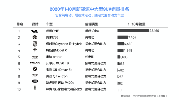 在1-10月新能源中大型SUV销量排名中,理想ONE更是以22160辆的上险数遥遥领先。而且这也是理想ONE连续第10个月超越蔚来ES8、保时捷Cayenne E-Hybrid、特斯拉Model X等车型,蝉联新能源中大型SUV市场冠军。