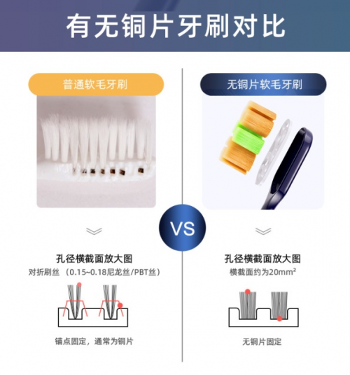绿色生活不仅仅是一个概念,更应贯穿我们生活的每一处。倍加洁深化绿色健康生活理念,在牙刷产品上创新性地使用了无铜片植毛工艺。在牙刷的传统植毛工艺中,普通牙刷往往都是通过铜片将刷丝固定在牙刷上,长期使用下铜片易腐蚀,滋生细菌;而无铜片植毛技术,刷毛采用热熔技术固定底部,拒绝铜片污染,减少了金属片的使用量,对环境更友好,同时也可以避免对口腔造成二次污染和伤害。
