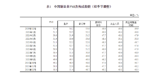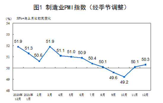 12月中国制造业PMI为50.3% 比上月上升0.2个百分点