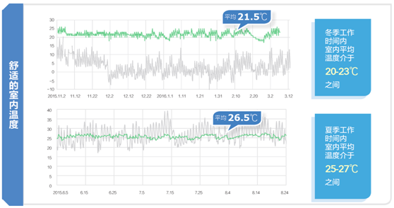 2015年供冷季示范楼内房间温度介于25-27℃之间,平均26.5℃,供暖季期间,工作时间段房间温度介于20-23℃之间,楼内房间平均温度为21.5℃。